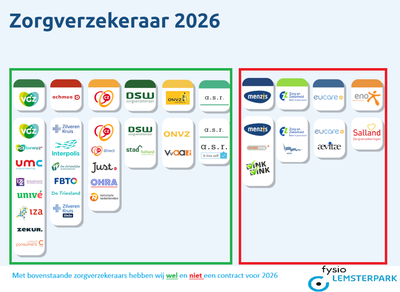 LET OP: Wij hebben geen contract met de CZ groep (CZ, OHRA, Nationale Nederlanden en Just), Menzis (Anderzorg, Hema, Link Link), Zorg en Zekerheid, ENO en Caresq (Aevitae). Indien u bij een van deze maatschappijen verzekerd bent, adviseren we om contact op te nemen met uw verzekeraar over de hoogte van de vergoedingen.